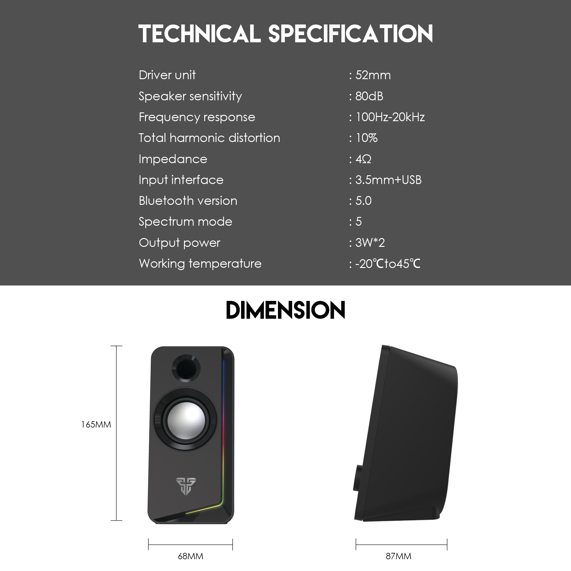 Zvučnik Fantech se odlikuje veličinom zvučnika od 52 mm, osetljivost zvučnika: 80 db, frekventni odziv: 100 hz-20 kHz, impedansa: 4 oma, povezivanje: 3,5 mm+USB, Bluetooth verzija: 5.0, 5. Režima RGB, Izlazna snaga: 3w. Ž